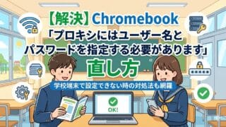 Chromebookで「プロキシにはユーザー名とパスワードを指定する必要があります」と出た時の解決策を解説。学校貸出端末で設定がグレーアウトして変更できない原因や、家と学校での対処法の違い、毎回ポップアップが出る問題の直し方まで網羅。ICT担当への相談方法も紹介します。